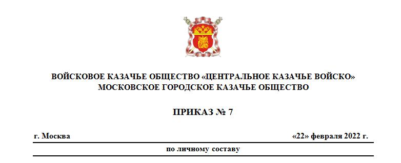 В соответствии с Федеральным законом от 05.12.2005 г. № 154-ФЗ «О государственной службе российского казачества», Уставом Московского городского казачьего общества,