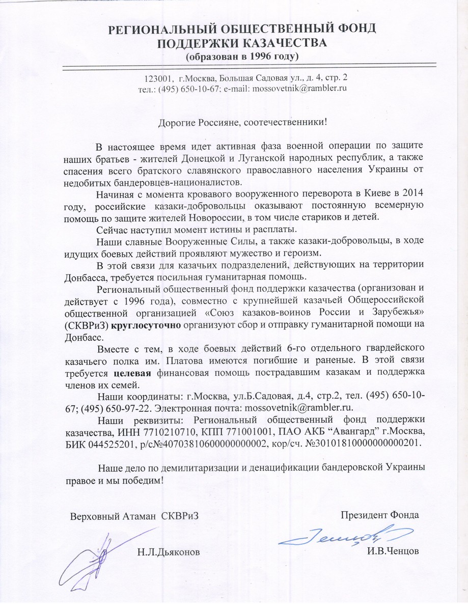 Дорогие Россияне, соотечественники! В настоящее время идет активная фаза военной операции по защите наших братьев - жителей Донецкой и Луганской народных республик, а также спасения всего братского славянского православного населения Украины от недобитых бандеровцев-националистов. Начиная с момента кровавого вооруженного переворота в Киеве в 2014 году, российские казаки-добровольцы оказывают постоянную всемерную помощь по защите жителей Новороссии, в том числе стариков и детей. Сейчас наступил момент истины и расплаты. Наши славные Вооруженные Силы, а также казаки-добровольцы, в ходе идущих боевых действий проявляют мужество и героизм. В этой связи для казачьих подразделений, действующих на территории Донбасса, требуется посильная гуманитарная помощь.